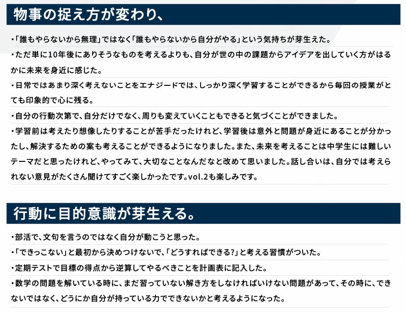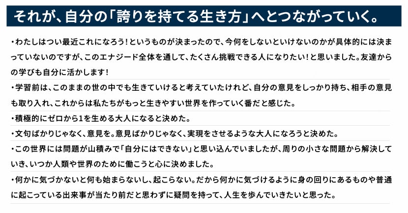 また、2025年度は、12万人の中高生がENAGEEDを通じて、「やったら、いけた」と思える自己効力の育成に取り組み続けています。